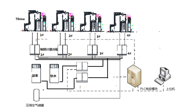 尿素溶液經(jīng)配制并儲(chǔ)存后,由在線稀釋系統(tǒng)根據(jù)鍋爐運(yùn)行情況和NOx排放濃度情況在線稀釋成所需的噴射量,送入噴射系統(tǒng)。噴射系統(tǒng)實(shí)現(xiàn)各噴射層的尿素溶液分配、霧化噴射和計(jì)量,還原劑的供應(yīng)量能滿足鍋爐不同負(fù)荷的要求。整套電氣控制系統(tǒng)調(diào)節(jié)方便、靈活、可靠,在設(shè)備間、爐房噴點(diǎn)現(xiàn)場(chǎng)及控制室均能聯(lián)動(dòng)控制。鍋爐脫硝整體工藝流程如下: